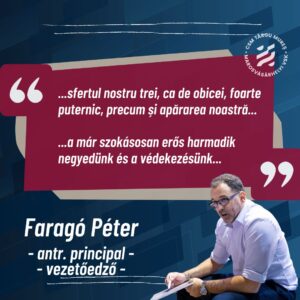 „A mai meccs szerintem 4 fontos dolgon múlt: az első, hogy mikor az ellenfél mindent bedobott, akkor nem estünk pánikba. A második, hogy a második negyedben találtunk rajtuk gyengébb pontot, amire sikerült szépen rájátszanunk és visszajönni a mérkőzésbe. A harmadik dolog a már szokásosan erős harmadik negyedünk és már a második negyedtől működő védekezésünk. A negyedik pedig, hogy a játékosok áldozatot hoztak és elkezdtek védekezni és okosan támadni, mert megértették, hogy ma nem tud mindenki sok pontot dobni és beálltak a sorba. Örülök, hogy sikerült domináns játékkal nyerni egy olyan csapat otthonában, aki később fog feltámadni. Várjuk kedves szurkolóinkat a következő hazai meccsre, hogy pozitívra fordítsuk a mérlegünket!”