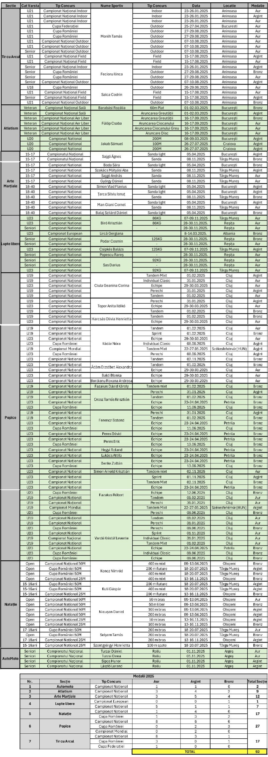 A MAROSVÁSÁRHELYI VÁROSI SPORT KLUB SPORTOLÓI ÁLTAL SZERZETT ÉRMEK A 2025-ÖS ÉVBEN