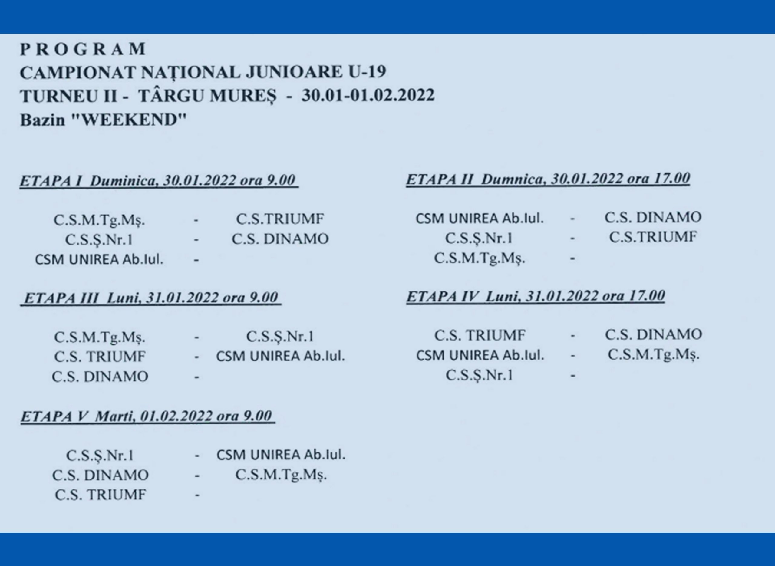 - jan. 30, vasárnap 9:00 óra VSK Marosvásárhely – CS Triumf Bukarest